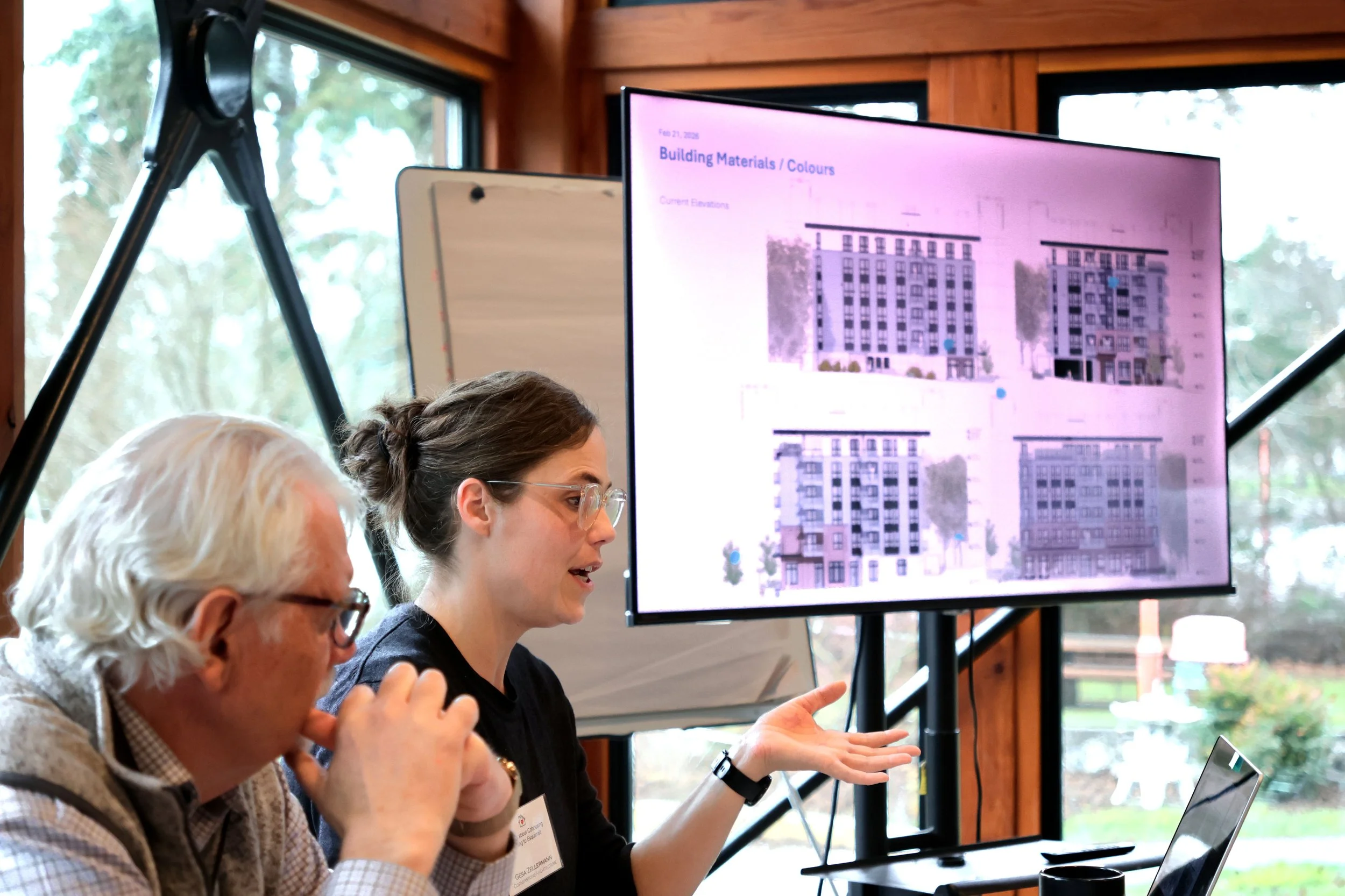 Architect Gesa Zellerman reviewed plans for a "friendlier" sidewalk interface and explored adjustments to ensure our communal open spaces remain unobstructed and full of life. A highlight of the discussion was our commitment to a generous "front porch" interface on Esquimalt Road—a design choice specifically intended to encourage connection with the broader neighbourhood.